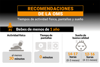 Para bebés de hasta un año, la OMS recomienda mantenerlos físicamente activos varias veces al día, incluyendo por lo menos 30 minutos de "tiempo boca abajo", recostado sobre su frente. Los bebes recién nacidos deben tener entre 14 a 17 horas de sueño al día, incluidas las siestas, que se reducen de 12 a 16 horas desde los 4 a los 11 meses. Los bebes no debe ser limitados (es decir, asegurados en sillas para bebés, en un carrito, en una silla alta o en la espalda de alguien) durante más de una hora.