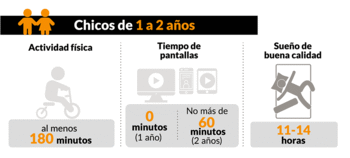 Para niños de entre uno y dos años, se recomienda al menos tres horas de actividad física al día, y entre 11 y 14 horas de sueño al día, incluyendo siestas. No debe ser sujetados por más de una hora a la vez o sentarse por largos períodos de tiempo.