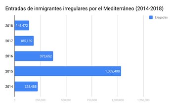 Si miramos el contexto europeo, la entrada de migrantes irregulares ha descendido en los últimos años. Según datos de ACNUR en el año 2018 entraron en Europa a través del Mediterráneo un total de 141.472 inmigrantes de forma irregular, frente a los 185.139 en 2017, 373.652 en 2016 o los 1.032.408 en 2015. España ha visto incrementar, dentro de este descenso general, el número de personas de origen irregular que han llegado a través del Mediterráneo, situándose a la cabeza el año pasado con 58.569 personas. Este incremento se produjo debido a la dificultad de acceso por las rutas oriental y central.
