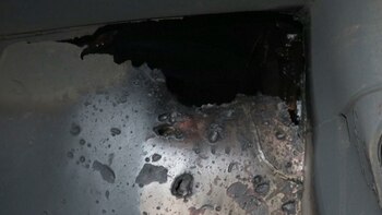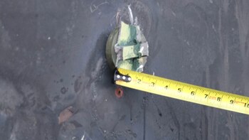 Otra fotografía muestra la cavidad causada por otra mina en el casco del mismo petrolero, que el Pentágono estima de más de un metro de diámetro.