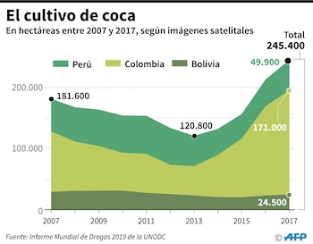 En la década de 2008 hasta 2017, se registró un aumento del 50% en la producción, alcanzando un récord de 1.976 toneladas dos años atrás, según el informe, que se basa en las cifras de los sistemas nacionales de monitoreo. En la misma década, la cantidad de cocaína incautada a nivel mundial subió un 74 por ciento.