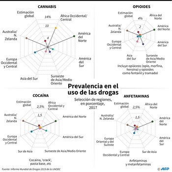 En tanto, el cannabis sigue siendo la droga más usada a nivel mundial con 188 millones de personas que la consumen, según el informe. Pero las más letales, con diferencia, son los opioides, causantes de dos tercios de las muertes atribuidas al consumo de estupefacientes.