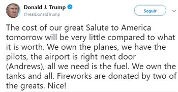 Trump dijo en un tuit que el gasto "será muy pequeño en comparación al valor que tiene". El costo del gran 'Saludo a EEUU' de mañana será muy poco en comparación con lo que vale", tuiteó este miércoles Donald Trump.