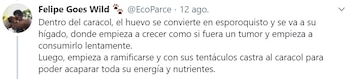 Un usuario de Twitter subió a la red un video de un llamativo caracol de colores brillantes pulsando los tentáculos en la cabeza, que en realidad son sus ojos, deseando a sus contactos un buen día con el hermoso animal. Sin embargo los comentarios no se hicieron esperar y uno de ellos, Felipe González Acevedo, estudiante de medicina veterinaria de 28 años, procedente de la ciudad de Neiva, Colombia, decidió explicar el horror detrás de tan peculiar molusco.