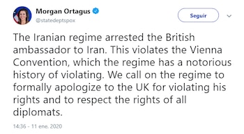 Por su parte, Morgan Ortagus, vocera del departamento de Estado de EEUU, se expresó en su cuenta de Twitter sobre el episodio: “El régimen iraní arrestó al embajador británico en Irán. Esto viola la Convención de Viena, sobre la que el régimen tiene una historia de violaciones. Hacemos un llamado para que se disculpe formalmente con el Reino Unido por violar sus derechos y respetar los derechos de todos los diplomáticos”.