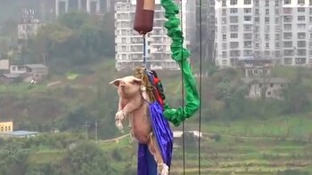En el inquietante video divulgado por el portal The Paper, se oye a un hombre decir: “El cerdo está muy asustado. Qué lástima”, y los chillidos del porcino al caer desde aproximadamente 70 metros. Mientras el animal rebota por la elasticidad de la cuerda, también se escuchan algunas risas de los observadores.