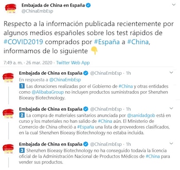 Por su parte, el embajada de China en España respondió a los informes de prensa y aseguró que la firma Bioeasy no está incluida en la lista ofrecida por Beijing sobre proveedores clasificados ni cuenta con la licencia de las autoridades médicas para vender sus productos. Además, aseguró que esta firma no ha sido incluida en el cargamento de donaciones del gigante asiático y empresas como AliBaba.