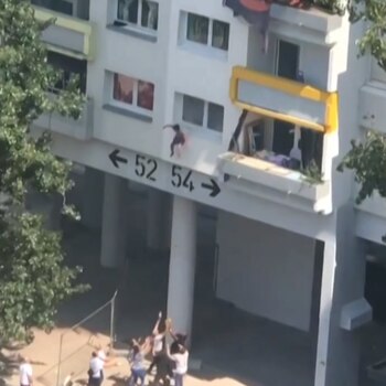 Las imágenes del drama del martes mostraron que uno de los hermanos fue arrojado desde una ventana que estaba a unos 10 metros de altura mientras las llamas envolvían un balcón y salía humo negro. A gritos de los espectadores, el hermano mayor salió por la ventana y se dejó caer a los brazos de los rescatistas reunidos debajo.
