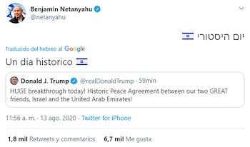 Así había definido Netanyahu horas antes y en su cuenta de Twitter el pacto sellado este jueves entre Israel y EAU. El mensaje del primer ministro israelí incluyó una cita a un tuit anterior del presidente Donald Trump, cuyo Gobierno ofició de mediador en el acuerdo.