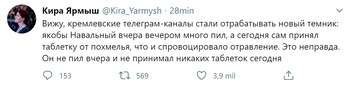Ante la insistencia de los medios oficiales son la versión que busca adjudicar a Navalny el consumo de drogas y bebidas alcohólicas la vocera remarcó la postura del entorno del dirigente en otro lapidario mensaje en la red social: “Los canales de Telegram del Kremlin empezaron a elaborar una nueva versión: supuestamente Navalny bebió mucho anoche, pero hoy se tomó una pastilla para la resaca, que provocó el envenenamiento. No es cierto. No bebió ayer y no tomó pastillas hoy”.