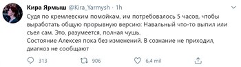 Kira Yarmysh, vocera del dirigente opositor, respondió con dureza desde su cuenta de Twitter: “A juzgar por los vertederos de basura del Kremlin, les tomó 5 horas llegar a una versión innovadora común: Navalny bebió algo o comió algo él mismo. Esto, por supuesto, es una completa tontería. La condición de Alexei aún no ha cambiado. No recuperó la conciencia, el diagnóstico no se informa”. El siguiente es en tuit en su idioma original: