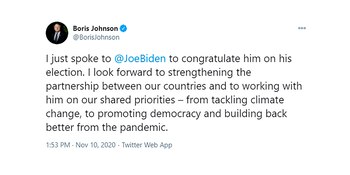 Johnson indicó en su cuenta de Twitter que había hablado con Biden para felicitarlo por su triunfo. “Deseo reforzar los vínculos entre nuestros países y trabajar con él en sus responsabilidades compartidas -desde abordar el cambio climático hasta promover la democracia y reconstruirnos después de la pandemia", expresó en su mensaje.