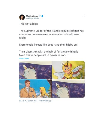 La periodista y activista iraní Masih Alinejad escribió en Twitter: “¡No es una broma! El líder supremo de la República Islámica de Irán ha anunciado que incluso las mujeres en las obras de animación deberían usar hiyab. ¡Hasta las versiones femeninas de los insectos, como las abejas, deberán usar hiyab!”, ironizó.