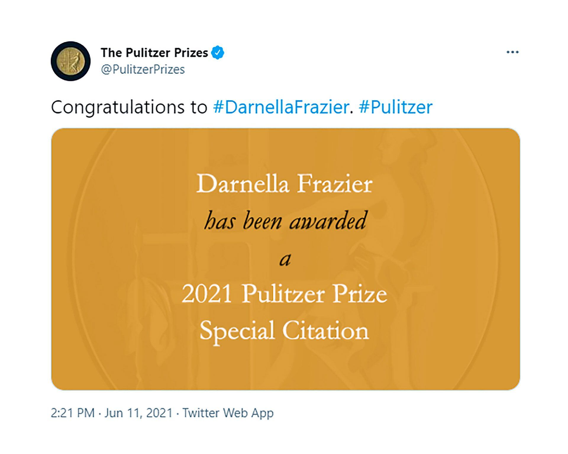 Frazier fue reconocida “por grabar con valentía el asesinato de George Floyd, un video que provocó protestas contra la brutalidad policial en todo el mundo, destacando el papel crucial de los ciudadanos en la búsqueda de la verdad y la justicia por parte de los periodistas”, dice la cita.
