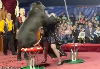 Un oso pardo atacó a su entrenadora en medio de una presentación frente a un grupo de niños horrorizados y sus familias, quienes no tenían barreras ni nada que los protegiera del animal. El episodio ocurrió ayer en el Circo Ambulante Harlequin en Berezovsky, Kemerovo, Rusia.
