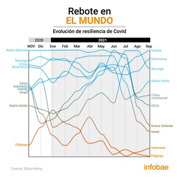 El Ranking de Resiliencia de COVID es una instantánea mensual de dónde se está manejando el virus de manera más efectiva con la menor agitación social y económica. Compilado utilizando 12 indicadores de datos que abarcan la contención del virus, la calidad de la atención médica, la cobertura de vacunación, la mortalidad general y el progreso hacia la reanudación de los viajes y la reducción de las restricciones fronterizas, la clasificación captura cuáles de las 53 economías más grandes del mundo están respondiendo mejor y peor a la misma amenaza.