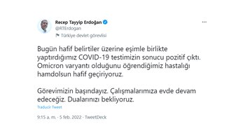 “Tras experimentar síntomas leves, mi mujer y yo hemos dado positivo en la prueba de COVID-19. Tenemos una infección leve afortunadamente, que sabemos que es la variante Ómicron”, dijo Erdogan en su cuenta de Twitter.