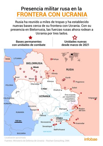 Las fuerzas de Moscú se concentran en el norte, este y sur de Ucrania en lo que el Kremlin insiste en que son ejercicios militares. Si ocurriera una invasión, no está claro dónde comenzaría. Rusia ha creado puntos de presión en Crimea al sur, en el lado ruso de la frontera de los dos países y en Bielorrusia al norte.
