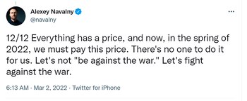 Navalny se expresó en ruso e inglés a través de un hilo de doce tuits en la red social. “Nosotros -Rusia- queremos ser una nación de paz. Por desgracia, pocos nos llamarían así ahora. Pero al menos no nos convirtamos en una nación de silenciosos asustados. De cobardes que fingen no darse cuenta de que la guerra agresiva contra Ucrania desatada por nuestro zar es evidentemente demente”, comenzó.