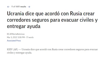 Representantes de los grupos negociadores de Rusia y Ucrania afirmaron que en la reunión de hoy se acordó un alto el fuego temporal en los lugares donde se establezcan corredores humanitarios para la evacuación de civiles en Ucrania, informó EFE y AFP.