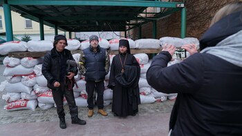 Makary tiene 42 años y es el sacerdote a cargo del monasterio. Bajo sus órdenes, hoy se están preparando para la lucha urbana. Cuando se dice que los rusos van a tener que pelear casa por casa, resulta que también será iglesia por iglesia. En esta, ahora mismo, hay cinco sacerdotes preparando una trinchera junto a su templo. Están cargando bolsas de arena y tablas de madera para construir un parapeto desde el cual no solo puedan defenderse sino también disparar. Para eso dejan huecos en el muro de bolsas, para disparar desde ahí. La imagen es surrealista.