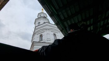 Ya en el segundo piso, unas ventanas abiertas, una imagen de la virgen sobre un estrado y una escalera caracol que lleva a la cúpula de la iglesia. Mientras recorremos el lugar, dos milicianos suben la escalera y dicen algo en ucraniano al sacerdote, que asiente con la cabeza y los deja pasar. Suben la escalera caracol hacía la torre. Harán, supongo, un punto de tiro.