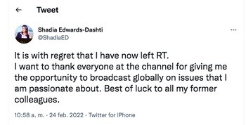 “Lamento haber dejado ahora RT. Quiero agradecer a todos en el canal por darme la oportunidad de transmitir a nivel mundial sobre temas que me apasionan. Mucha suerte a todos mis antiguos compañeros”, escribió en su cuenta de Twitter la periodista Shadia Edwards-Dashti. Ella trabajaba para RT desde Londres. Eran las 10:58 de la mañana del 24 de febrero cuando anunció su dimisión. Apenas habían pasado cinco horas desde la invasión.
