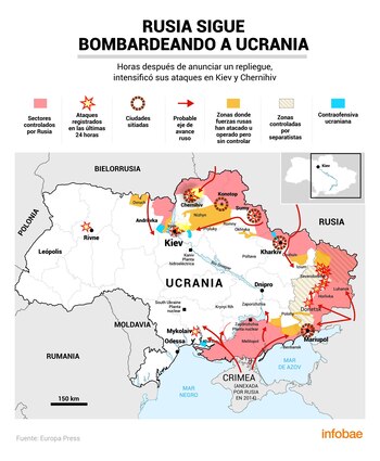 6:00: Las Fuerzas Armadas de Ucrania afirmaron este martes que Rusia ha retirado unidades militares de las regiones de Kiev y Chernígov para concentrar sus esfuerzos en el este del país, pero ha alertado de que esta acción busca “engañar” al liderazgo militar de Ucrania.