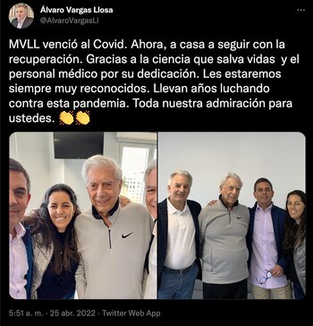 “Gracias a la ciencia que salva vidas y el personal médico por su dedicación. Les estaremos siempre muy reconocidos. Llevan años luchando contra esta pandemia. Toda nuestra admiración para ustedes”, agregaron los hijos de Vargas Llosa en el mensaje en la red social.