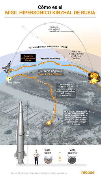 El misil hipersónico Kh-47M2 Kinzhal, que en ruso significa “daga” y tiene la capacidad de volar a Mach 5 o cinco veces la velocidad del sonido en algunas versiones y en otras hasta Mach 10. Además, puede cargar una bomba convencional de 1000 kilos o una ojiva nuclear y tiene el alcance de fuego de hasta 2000 kilómetros, la distancia entre Buenos Aires y Santiago de Chile o San Pablo.