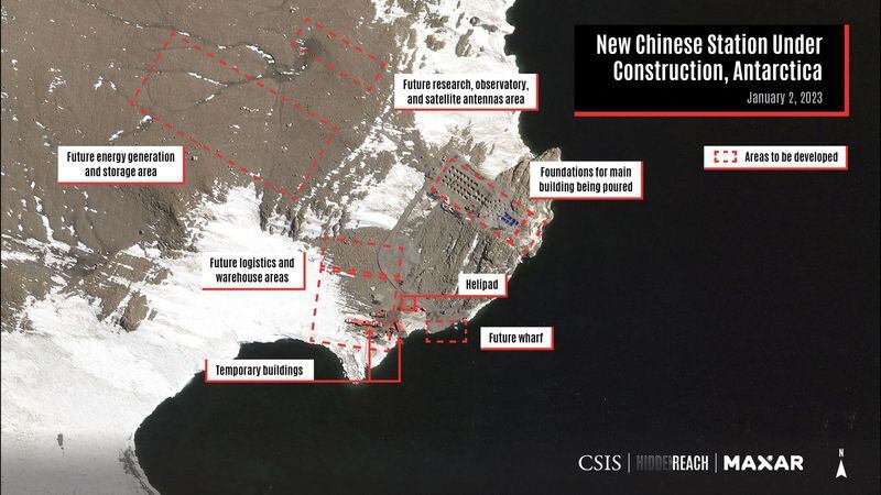 El CSIS utilizó imágenes de satélite tomadas en enero para identificar nuevas instalaciones de apoyo, edificios provisionales, un helipuerto y los cimientos de un edificio principal más grande en la estación de 5.000 metros cuadrados. Se calcula que la construcción podría estar terminada en 2024.