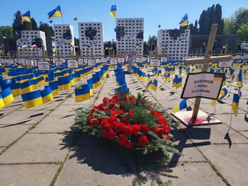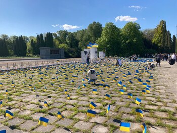 La instalación incluía cientos de banderas ucranianas azules y amarillas ondeando y cruces que servían de lápidas simbólicas por los ucranianos asesinados por los rusos durante la guerra iniciada por Moscú el año pasado.