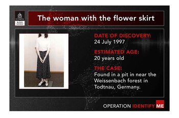 El 24 de julio de 1997 se encontró el cuerpo parcialmente quemado de una mujer en una fosa en el extremo sur de Alemania, cerca de las fronteras con Francia y Suiza. Cerca de la fosa se encontró una pala. Se cree que la mujer permaneció allí desde varios días hasta unas dos semanas. No fue posible establecer la causa exacta de su muerte ni identificarla.