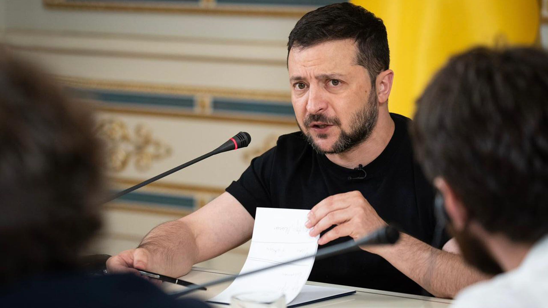 Estamos sentados alrededor de una mesa ceremonial, cada un con su micrófono y con un auricular para la traducción simultánea. El vocero de Zelensky entra primero y da algunas pautas. Se sienta en una silla a la derecha de la que usará el presidente. Dice que tenemos una hora y media, y señala un pequeño reloj dorado que tiene frente a sí sobre la mesa. Un segundo después, casi sorpresivamente, entra el jefe de estado más solicitado del mundo: Volodimir Zelensky. El tiempo comienza a correr.