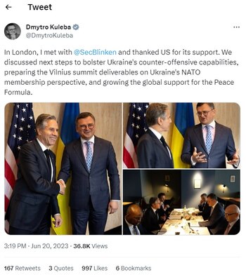 Según manifestó Kuleba en su perfil oficial de Twitter, en el encuentro aprovechó para abordar con Blinken los pasos a dar para “reforzar las capacidades ucranianas en la contraofensiva”, así como para “preparar” la futura cumbre de la OTAN en Vilna y “aumentar el apoyo global para la Fórmula de Paz”.