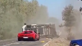 Las imágenes del accidente se dieron a conocer en las redes sociales. En las mismas se ve el momento en que el magnate de la hostelería y el sector inmobiliario Vikas Oberoi es protagonista del accidente al intentar adelantarse con su Lamborghini a una caravana que tenía delante.