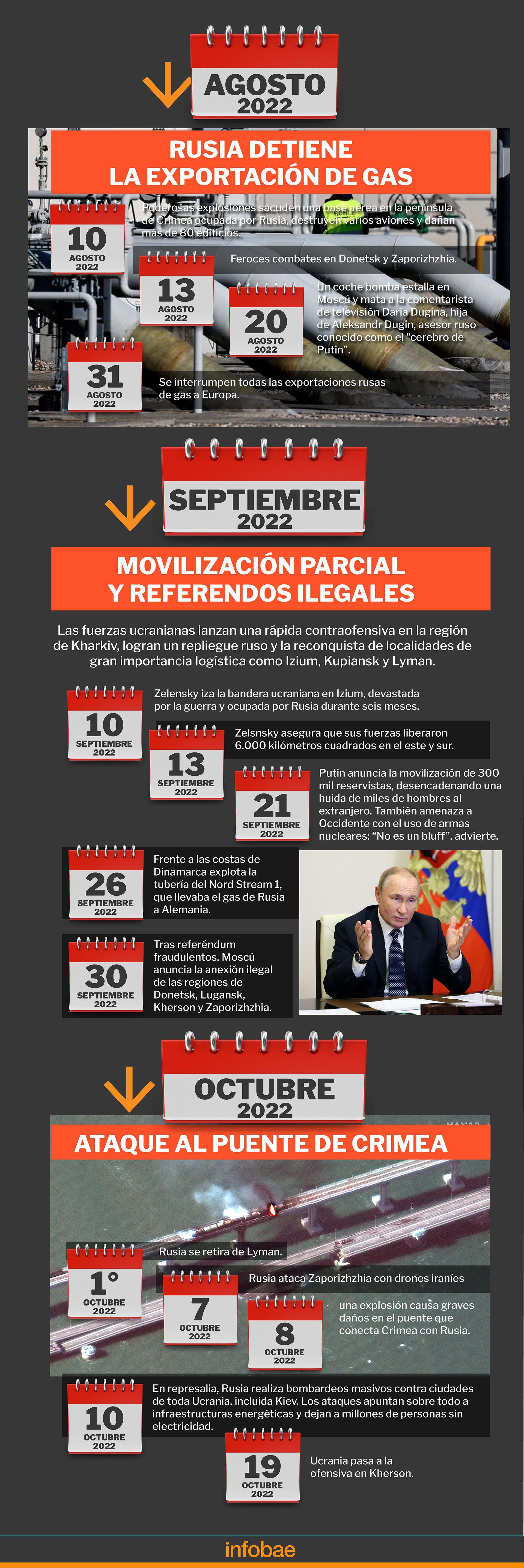El prestigio de Rusia sufre un duro golpe el 8 de octubre cuando el puente de 19 kilómetros que une territorio continental ruso con la anexada península de Crimea sobre el estrecho de Kerch, orgullo de Putin, es parcialmente destruido. El hecho ocurre un día después del cumpleaños del presidente ruso y afecta una importante ruta de suministro para las fuerzas de Moscú.