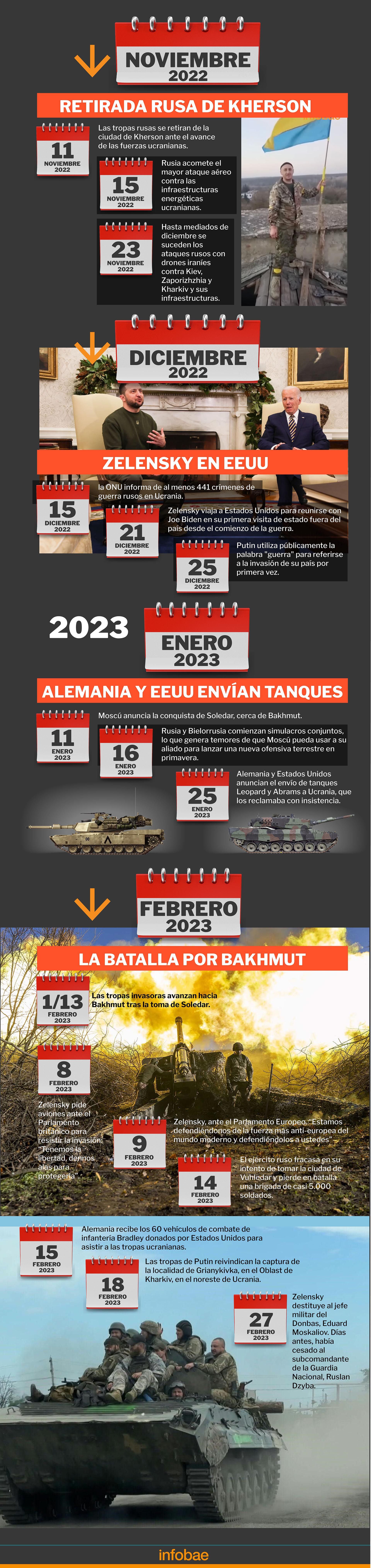 Para ese entonces, las tropas rusas siguen atacando al norte de Bakhmut y recuperan todo el terreno perdido desde junio. El 25 de noviembre, en apenas 24 horas, lanzan 84 misiles de crucero sobre territorio ucraniano.