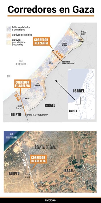 El corredor de Filadelfia es una franja, de apenas 100 metros de ancho en algunos tramos, que recorre los 14 kilómetros de la frontera con Egipto que va desde Gaza. Incluye el cruce de Rafah, que era la única salida de Gaza al mundo exterior que no estaba controlada por Israel hasta que el ejército tomó el control de todo el corredor en mayo.