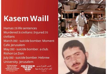 Kasem Waill: Era el líder terrorista de Hamas en Silwan, barrio de Jerusalén Este, la parte palestina de la ciudad. Estaba condenado a 35 cadenas perpetuas por participar en los ataques del Café Moment y la Universidad Hebrea en la ciudad, que se cobraron la vida de 11 y 9 personas respectivamente, y el del Club Sheffield, donde 15 personas murieron y 50 resultaron heridas.