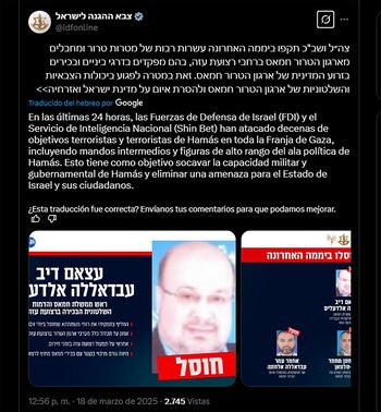 “Las FDI están atacando actualmente objetivos de la organización terrorista Hamas en toda la Franja de Gaza para lograr los objetivos de la guerra, determinados por la cúpula política, incluyendo la liberación de todos nuestros rehenes, tanto vivos como fallecidos”, señaló el comunicado del Gobierno israelí.