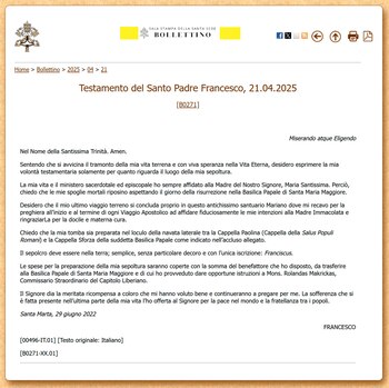 “Solicito que mi sepulcro sea preparado en el nicho de la nave lateral entre la Capilla Paulina (Capilla de la Salus Populi Romani) y la Capilla Sforza de la citada Basílica Papal como se indica en el documento adjunto. El sepulcro debe estar en la tierra; sencillo, sin decoración particular y con la única inscripción: Franciscus”, se lee en le testamento publicado hoy tras su muerte a los 88 años.