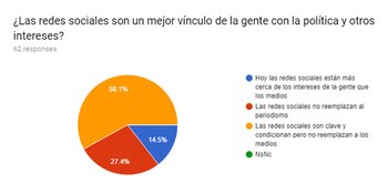Pero ante la pregunta de si las redes sociales son un mejor vínculo de la gente con la política, solo el 14 por ciento contesta afirmativamente. El 85 por ciento de los profesionales argentinos de comunicación cree que "las redes sociales no reemplazan al periodismo".