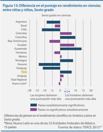 Los resultados del último estudio PISA- el conocido estudio llevado a cabo por la OCDE que mide el rendimiento académico de los alumnos en matemáticas, ciencia y lectura en el mundo- datan lamentablemente del año 2018, pero ya evidenciaban una diferencia de 11 puntos entre el resultado promedio de las mujeres (406 puntos) y la de los hombres (395 puntos). Esta diferencia estadísticamente significativa es recurrente en las evaluaciones nacionales del área de comunicación desde 2016. Sin embargo, el puntaje en matemáticas de los niños da mejores resultados, con 16 puntos de brecha respecto a las niñas. Si bien en 2018 tanto hombres como mujeres incrementaron de manera significativa sus puntajes promedio con relación al ciclo anterior, esta mejora fue mayor para los hombres (17 puntos) que para las mujeres (10 puntos).