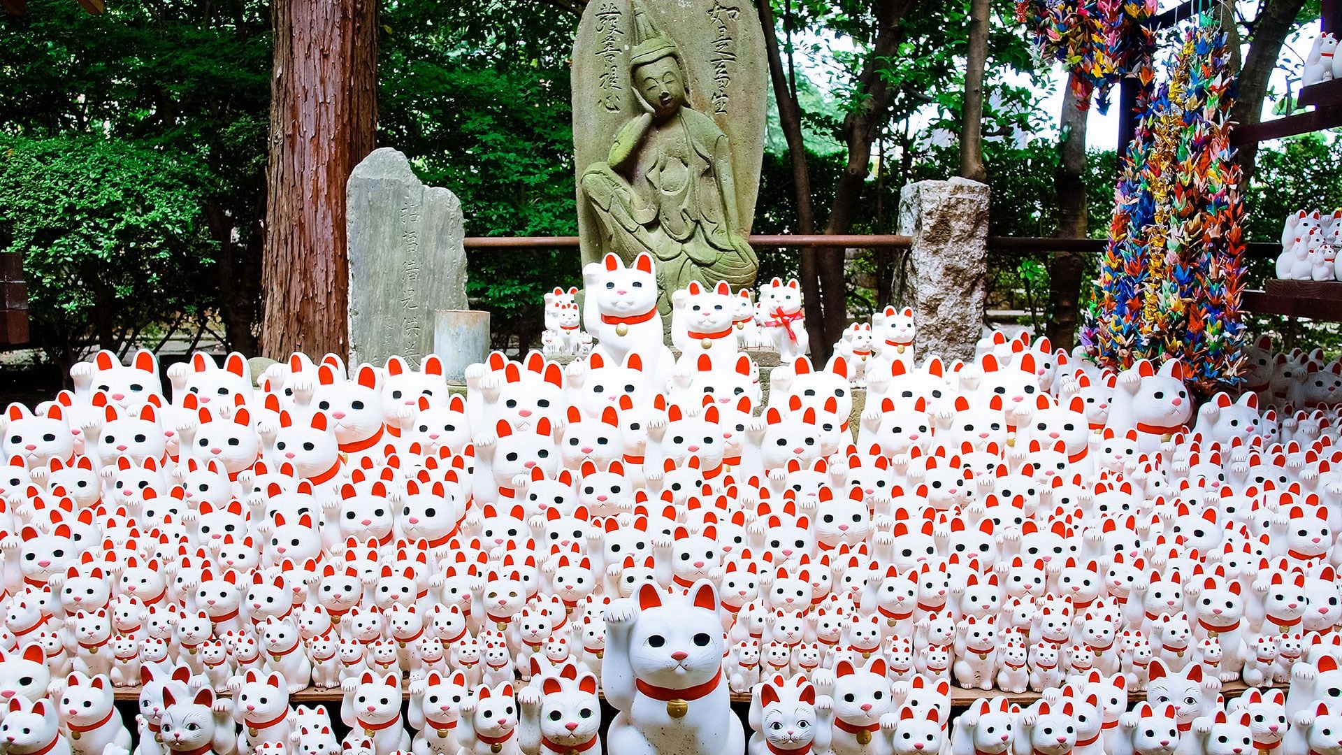 La leyenda cuenta que un día, un samurái decidió tomar un descanso bajo un gran árbol cerca de un templo, de repente se topó con un gato que parecía saludarlo con la pata, invitándolo a pasar al templo.