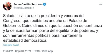 “Saludo la visita de la presidenta y voceros del Congreso, que recibimos anoche en Palacio de Gobierno. Coincidimos en que la cuestión de confianza y la censura forman parte del equilibrio de poderes, y son herramientas políticas para mantener la estabilidad democrática”, escribió Pedro Castillo.