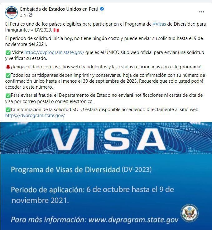 Este miércoles, la Embajada de Estados Unidos en Perú dio a conocer que el país es uno de los países elegibles para participar en el Programa de Visas de Diversidad para Inmigrantes # DV2023. El periodo de solicitud inicia hoy, no tiene ningún costo y puede enviar su solicitud hasta el 9 de noviembre del 2021.