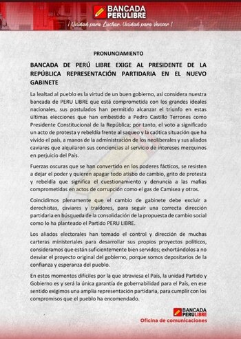 Simultáneamente a estas declaraciones, la bancada de Perú Libro publicó este pronunciamiento: