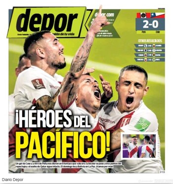 El Comercio puso “tres puntos más cerca del sueño”, mientras que Depor colocó “héroes del Pacífico”, en alusión a la conmemoración del Combate de Angamos.