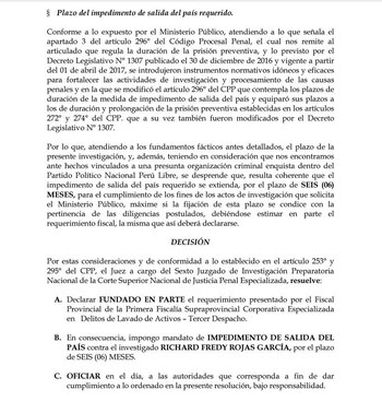 La decisión fue adoptada por el juez John Pillaca Valdéz. El requerimiento de la Fiscalía de Lavado de Activos era que se le prohibiese salir del país por un plazo de 12 meses, sin embargo, solo se dictaron 6 meses.